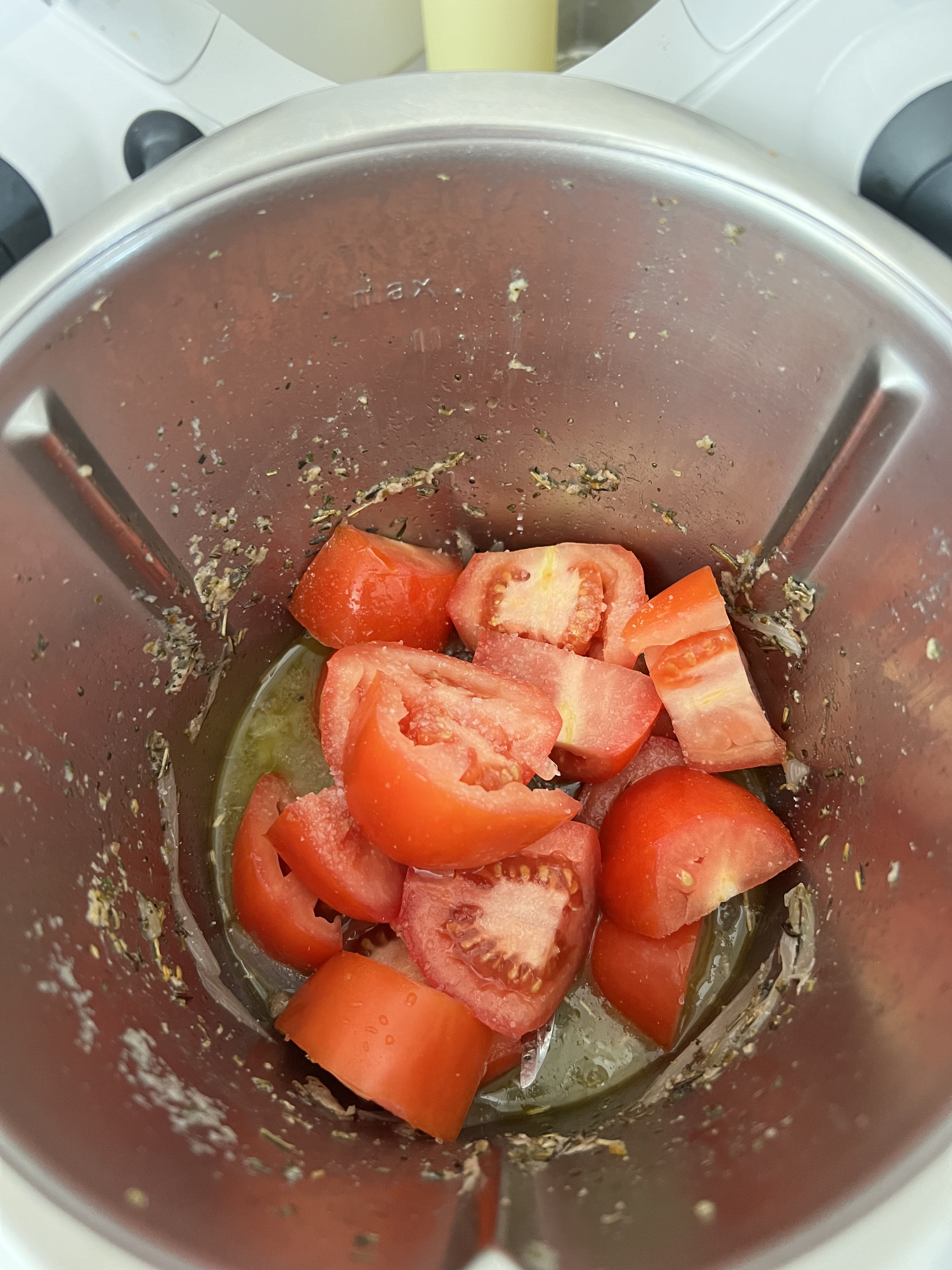 7. Agrega los tomates y la sal y coloca el varoma en su posición. Programa 25 min/Varoma/giro inverso/vel 1.