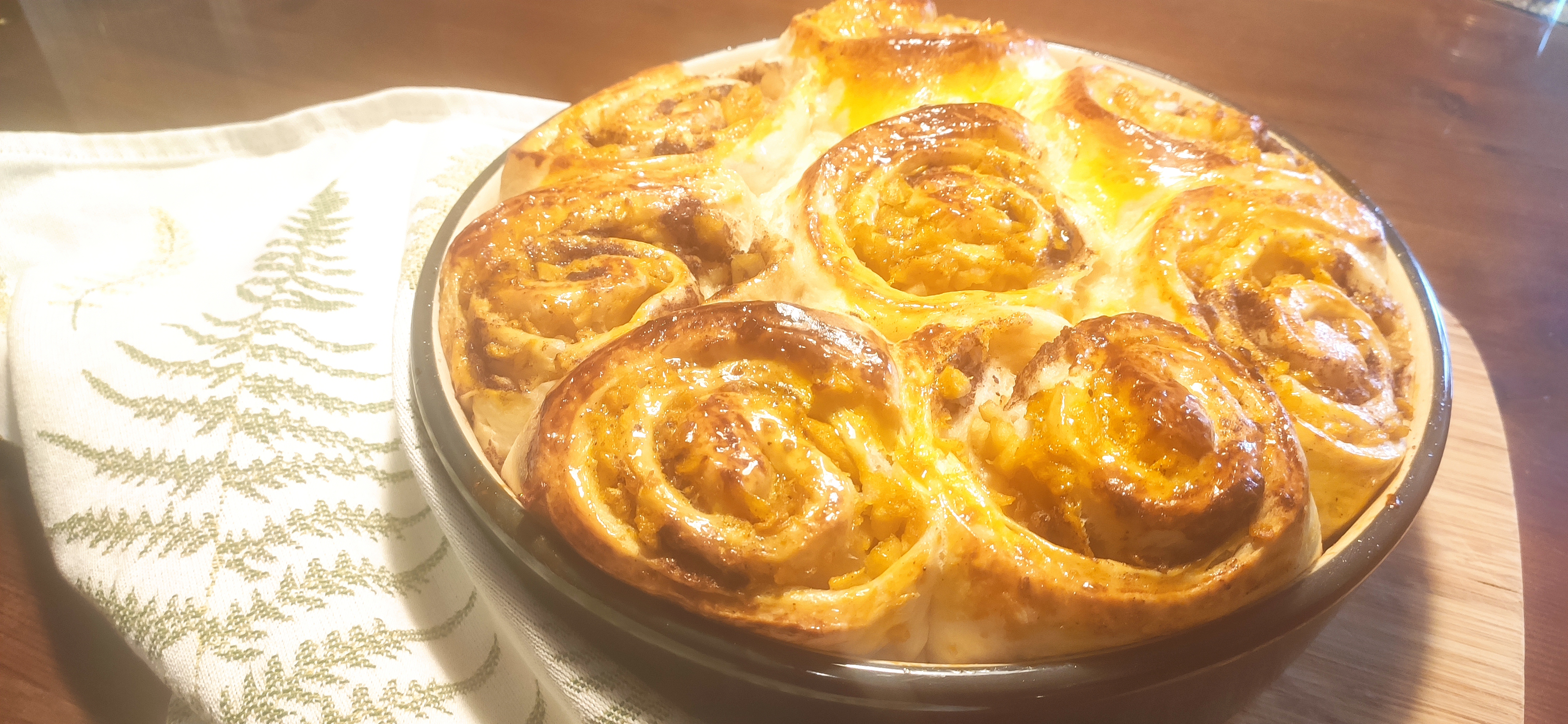 Se trata de una masa tipo brioche con relleno de mantequilla, canela y compota de manzana.