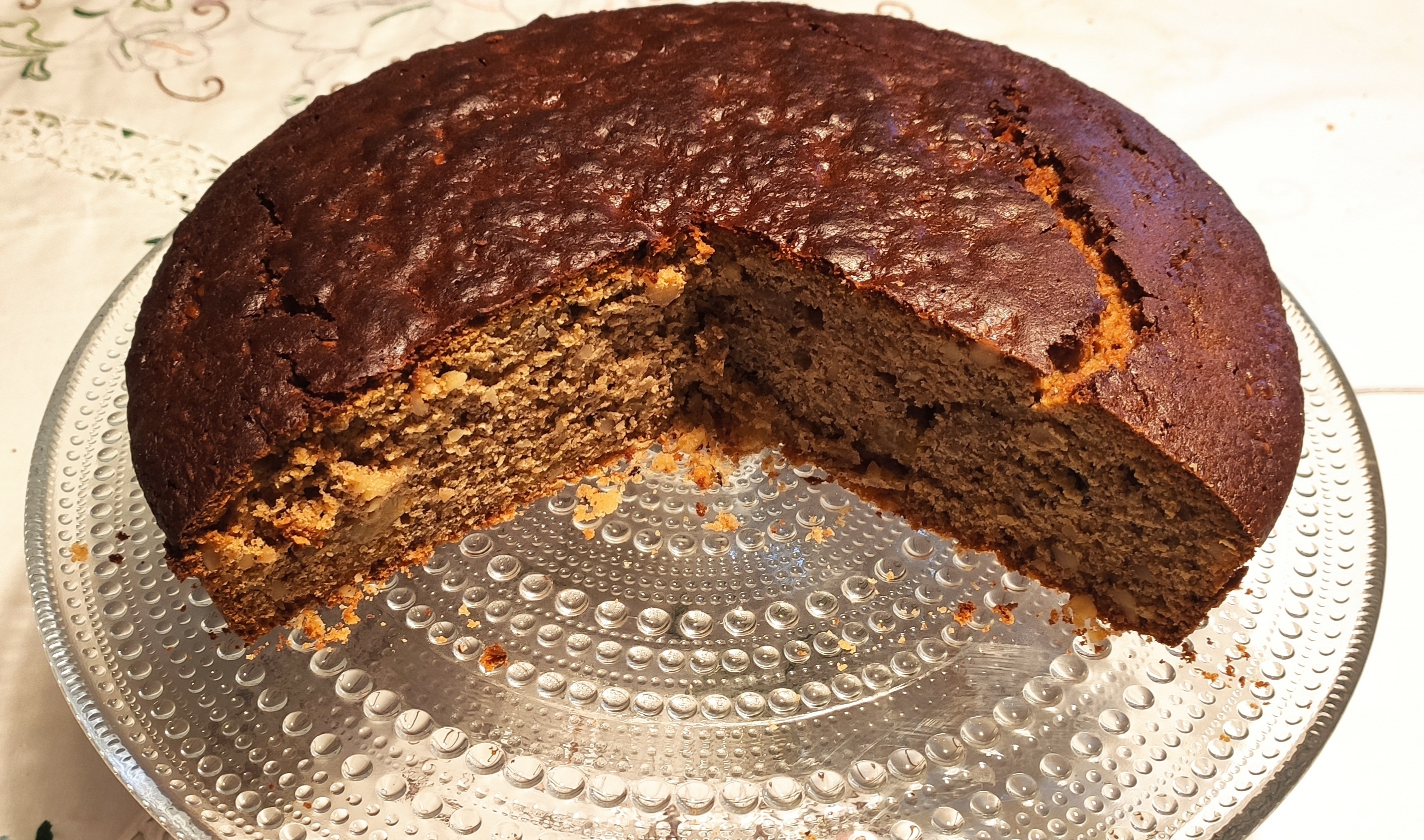 Es un bizcocho que lleva harina de centeno, frutos secos y naranja confitada, que le da un toque de frescura ¡No dejes de poner la naranja! Yo la hice casera con Thermomix. Es una receta de una colega de Levante que queda genial y no tan azucarada como las que venden.