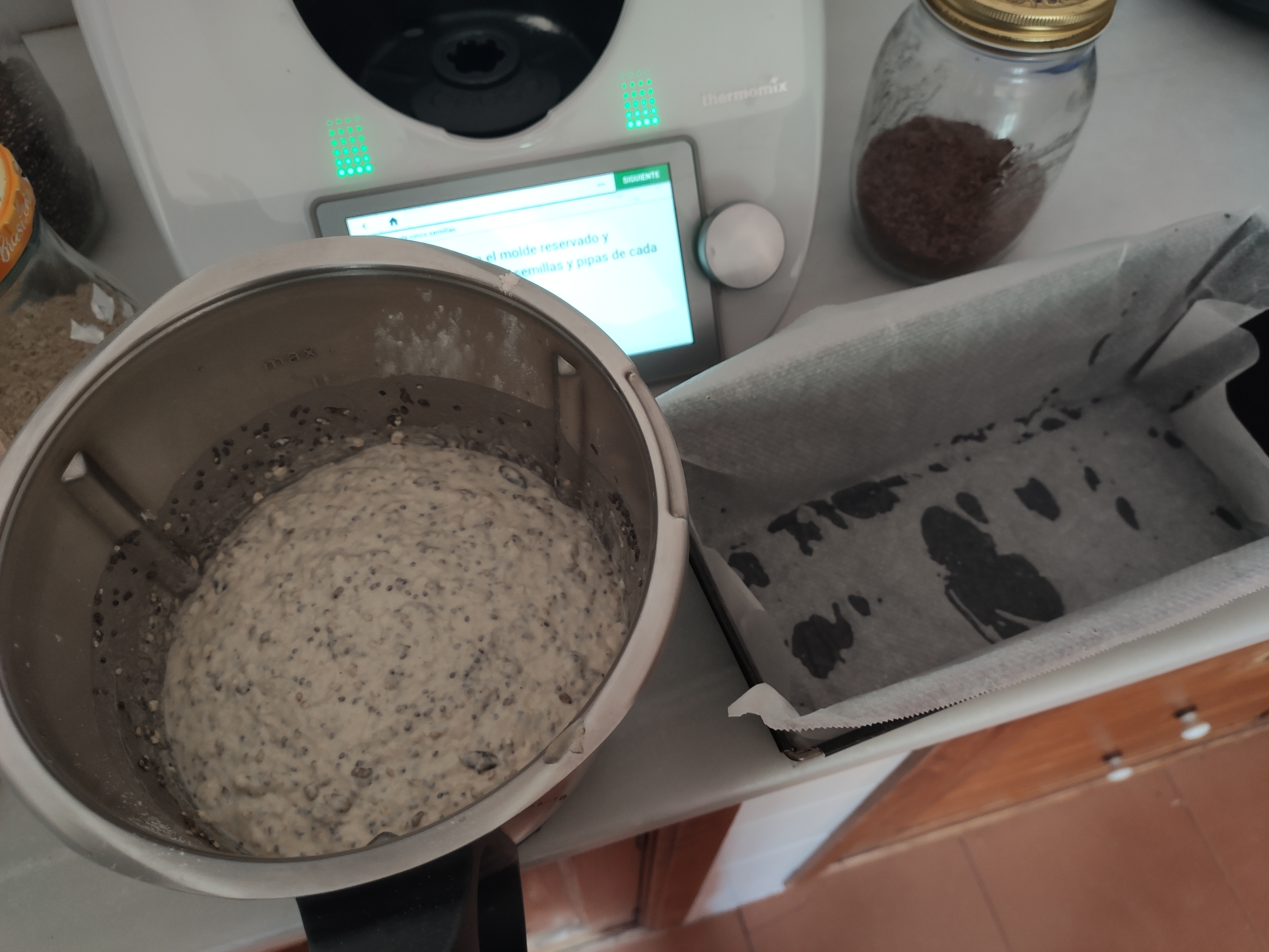 1. Pon en el vaso el agua y la levadura y programa 2 min 30 seg/37°C/vel 2. Mientras tanto, forra con papel de horno un molde rectangular (de 1,5 litros de capacidad) Si mojas con agua la base del molde, el papel se quedará fijo.
