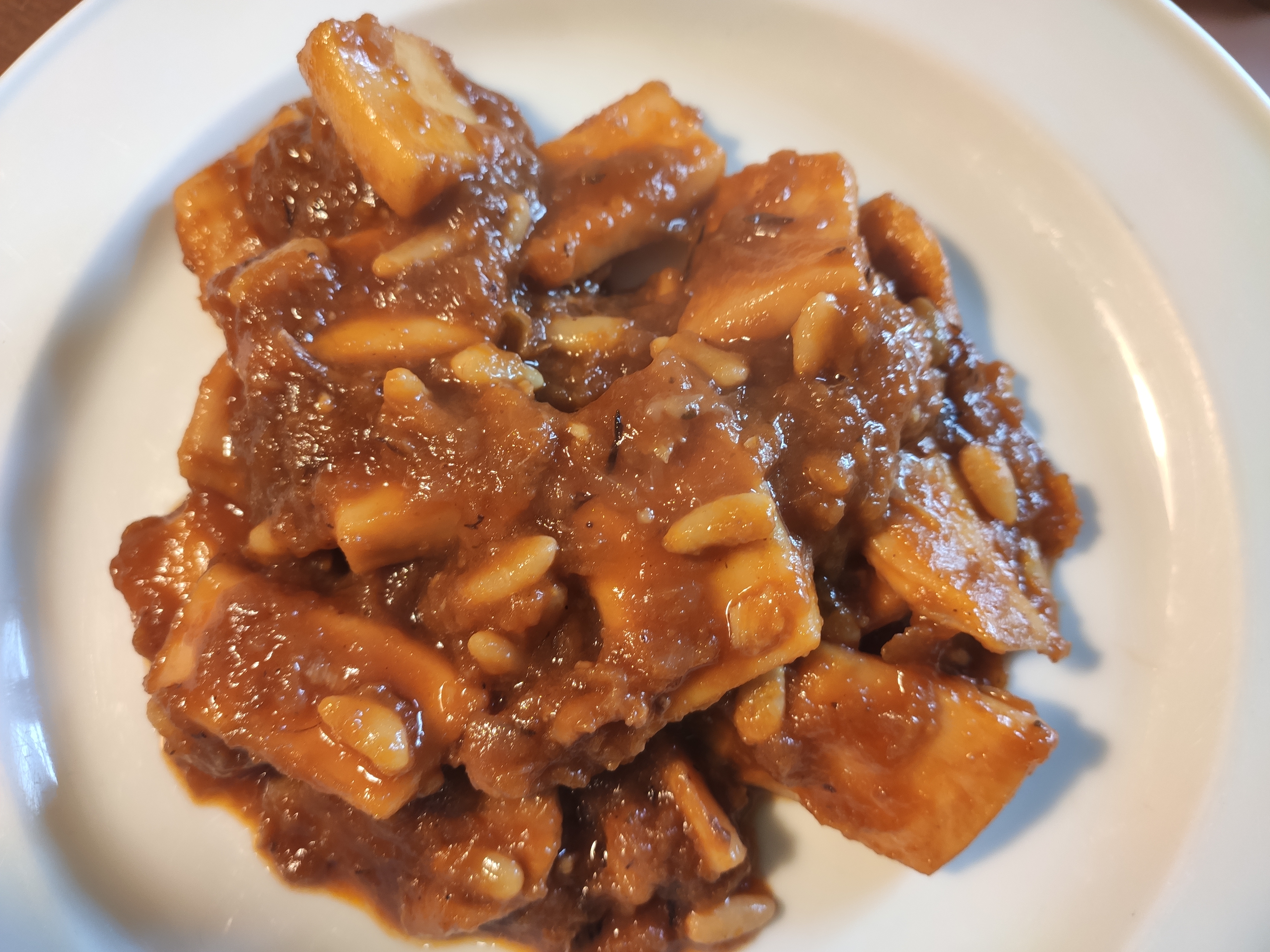 5. Añadir los calamares, el caldito, las pasas, los piñones y la pimienta y rehogar 5 min120º/giro inverso/cuchara.