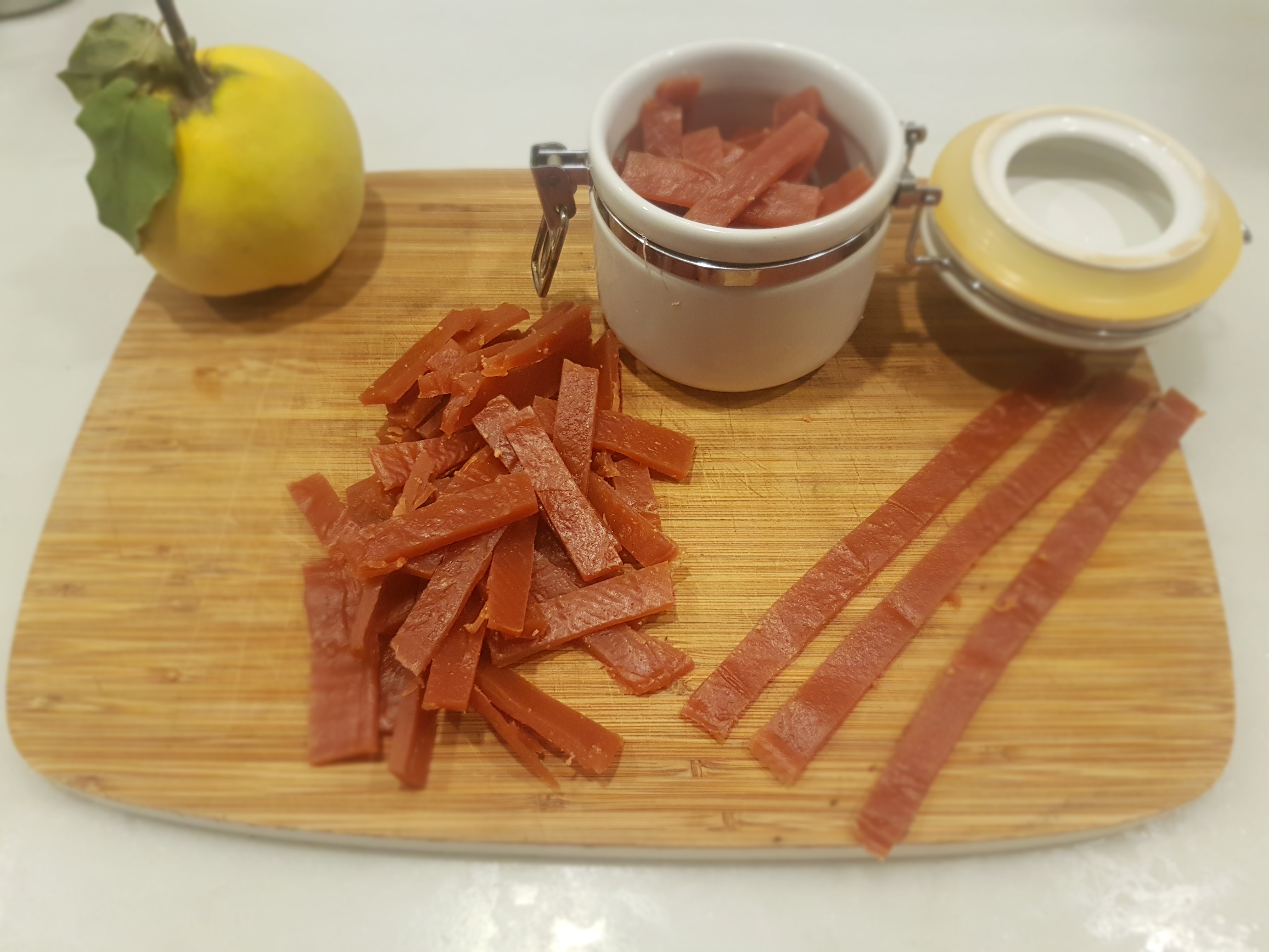 9. Parte la plancha de membrillo en trozos como desees, dados o tiras y guarda en un tarro herméticamente cerrado.