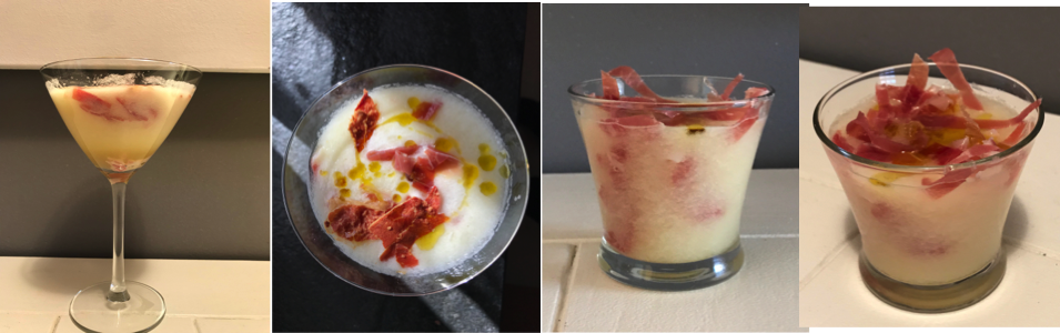 3. Servimos en copas o vasitos pequeños, adornamos con los trocitos de jamón, echamos un chorrito de aceite y un poquito de sal Maldon.
