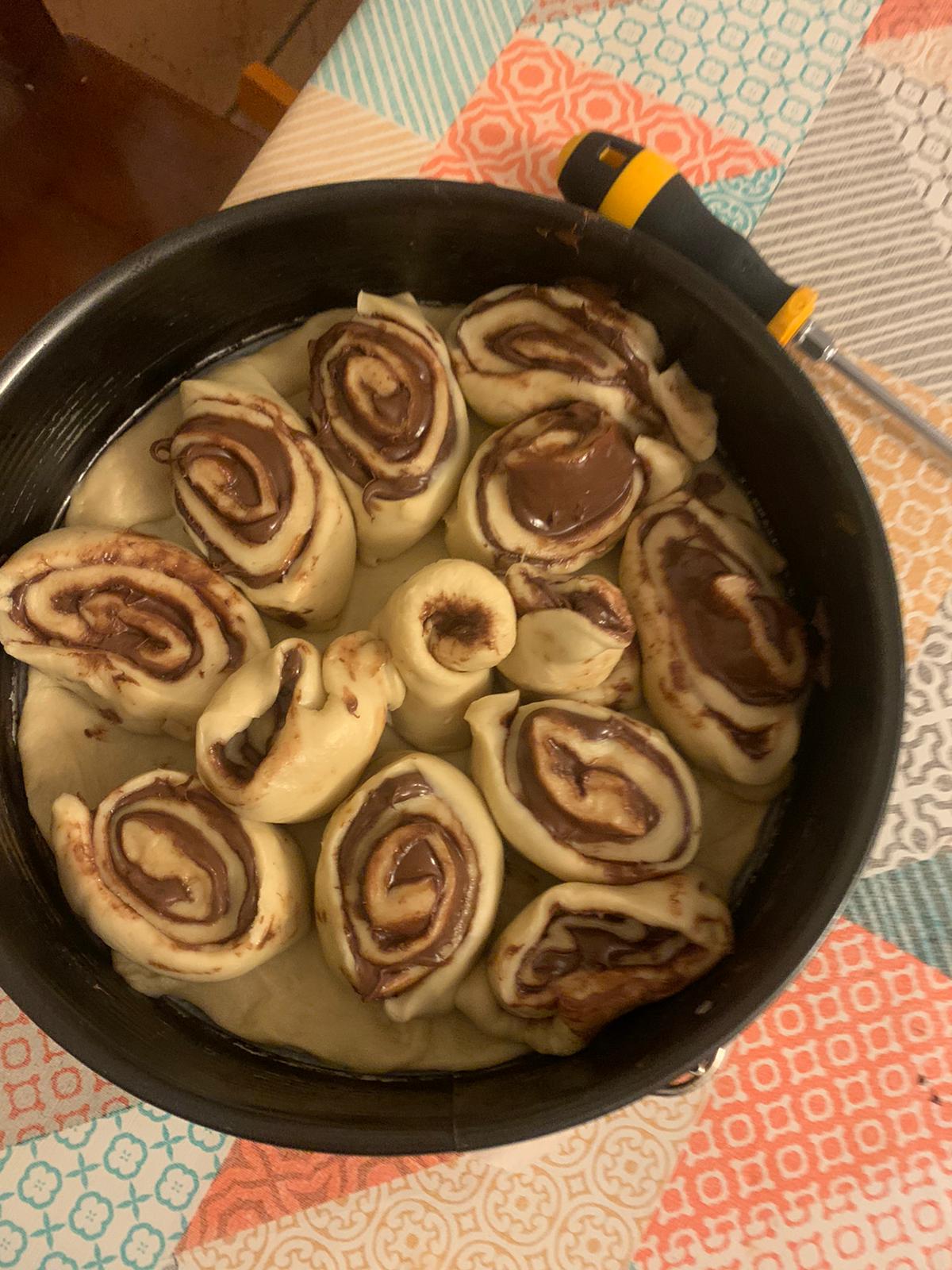 4. Con la espátula, baje la masa hacia el fondo del vaso y amase 1 min/ Retire la masa del vaso y forme una bola. Corte una porción de masa (aprox. 200-250 g), extiéndala con el rodillo y forre el interior de un molde desmontable (Ø 26 cm) previamente engrasado y enharinado o forrado con papel de horno. Extienda el resto de la masa en forma de rectángulo (aprox. 40x40 cm) y unte la superficie con la crema de cacao. Enrolle como si fuera un brazo de gitano y corte el rollo en 12 rodajas. Colóquelas dentro del molde, unas al lado de otras, dejando un pequeño espacio de separación para la subida.