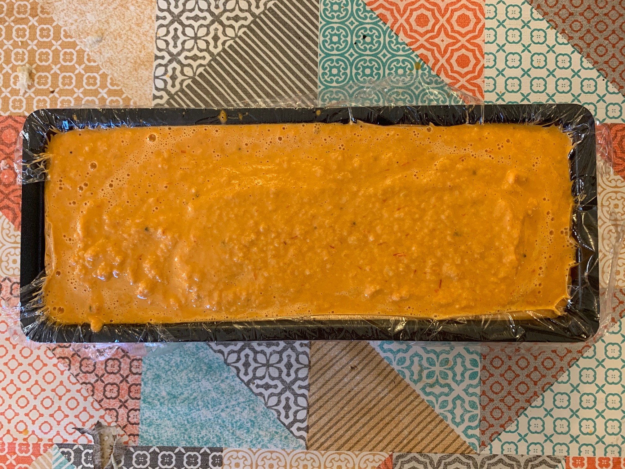 1. Forre con film transparente un molde de cake de aprox. 30x12x10 cm. Reserve.