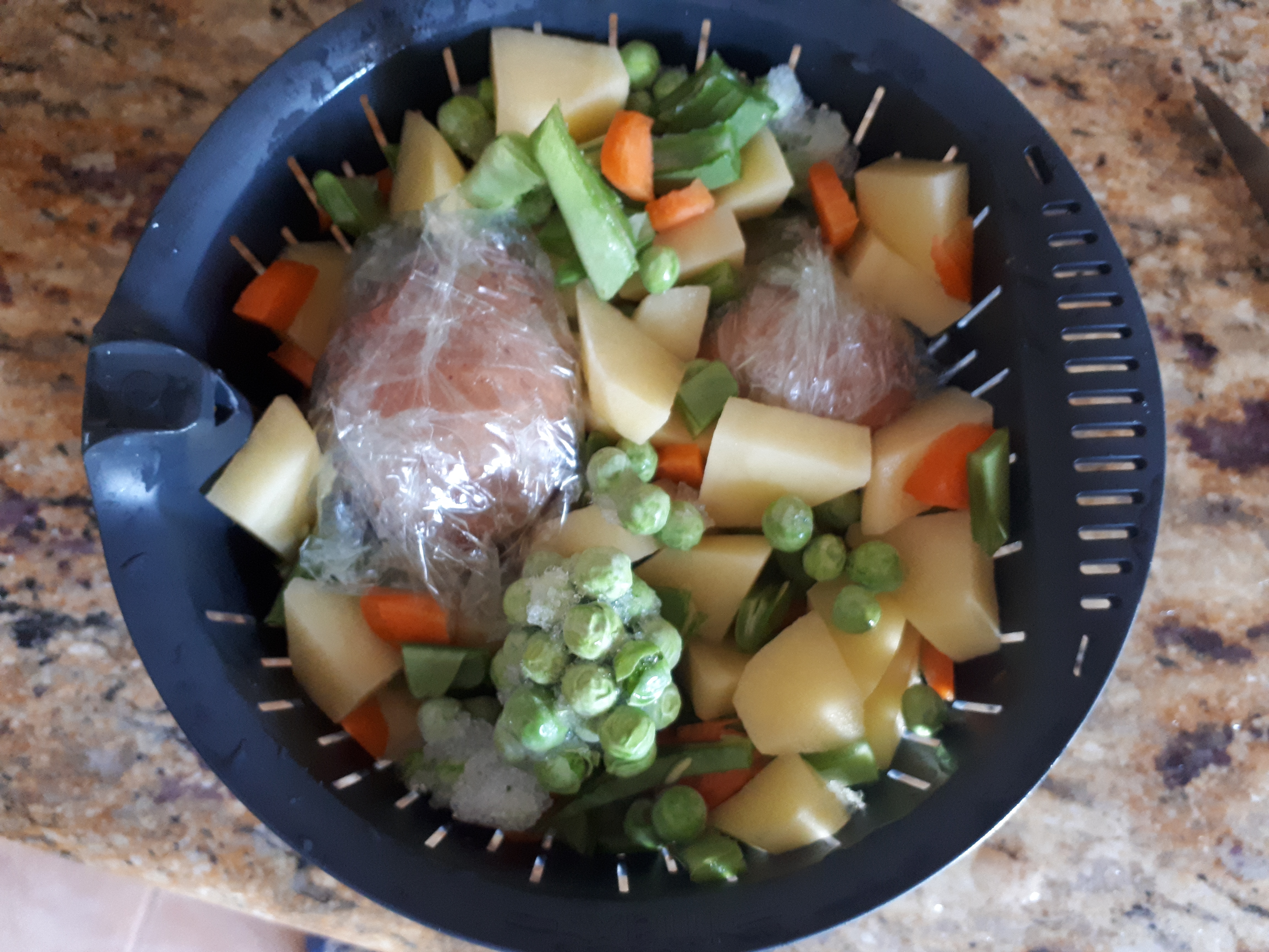- Colocar todos los ingredientes en el CESTILLO (patatas, zanahorias, judías, guisantes y huevos). Programar 25 min/VAROMA/vel.1.