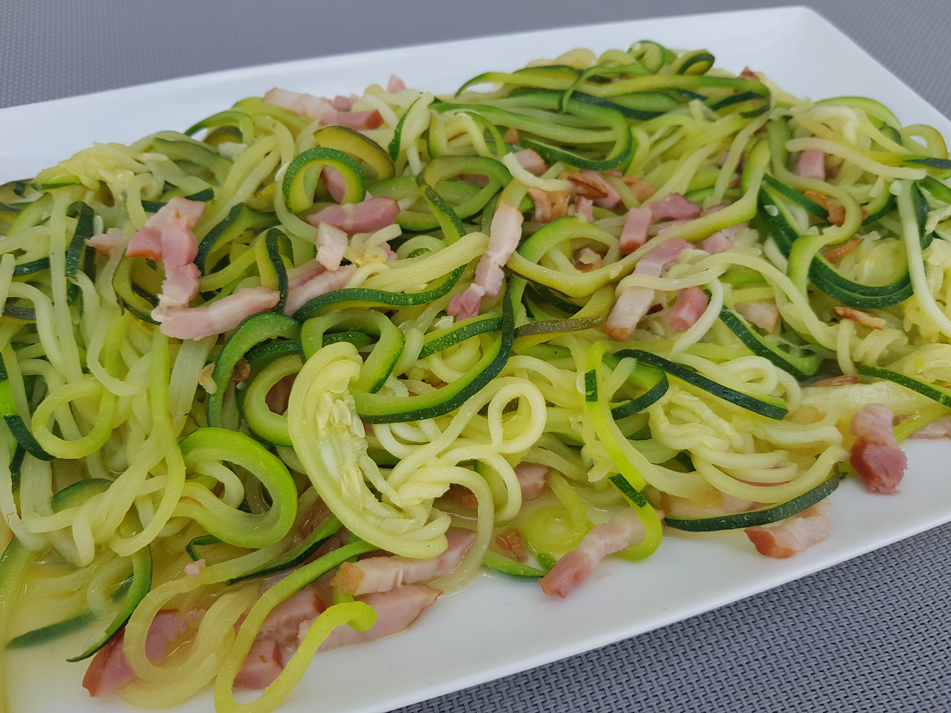 - -Con la espátula, bajar el ajo, incorporar el aceite y los dados de beicon, y sofreir 4 mins/120 grados/giro inverso/vel cuchara. Verter el sofrito sobre el calabacín.
