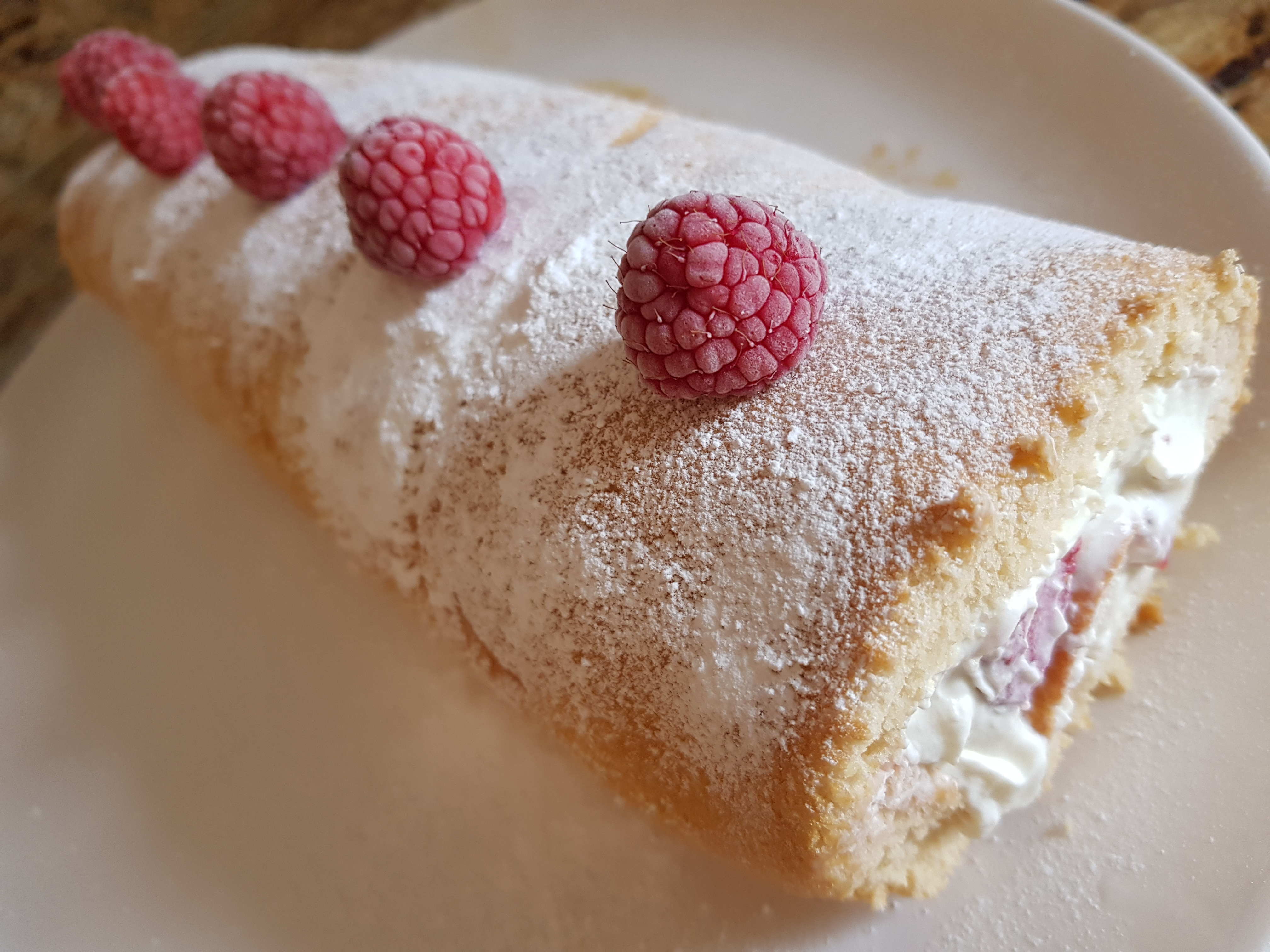 - Desenrollar cuidadosamente el bizcocho, retirar el paño y colocar el bizcocho sobre un rectángulo de film transparente. Extender la mermelada por la superficie y poner encima la nata montada, de manera que haya mayor cantidad en el extremo donde se empieza a enrollar y dejando sin nata la última franja de bizcocho (aprox. 10 cm). Colocar las frambuesas o fresas sobre la nata. Con la ayuda del film transparente, enrollar el bizcocho apretando bien para evitar que queden huecos. Reserve en el congelador durante aprox. 1 hora.